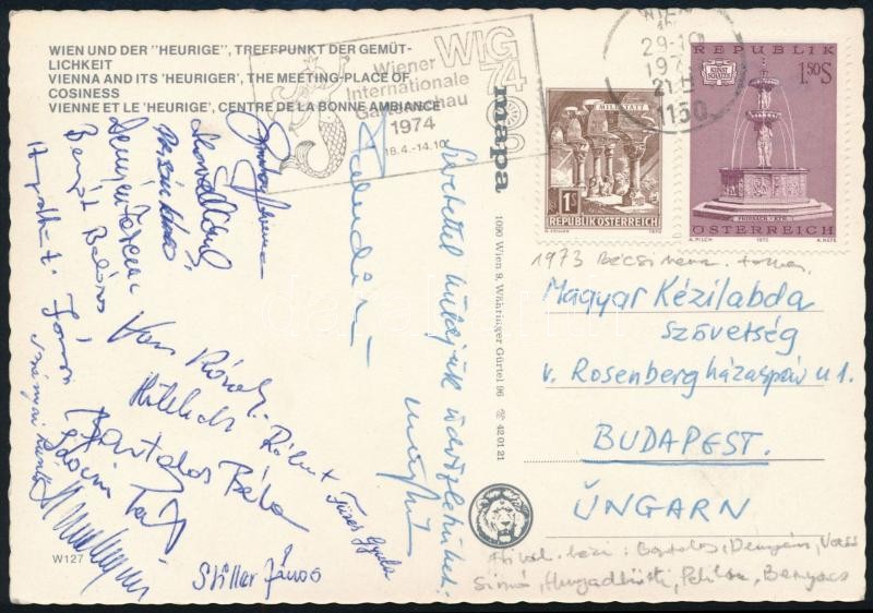 Leírás: 1973 A férfi kézilabda válogatott tagjainak aláírása hazaküldött képeslapon