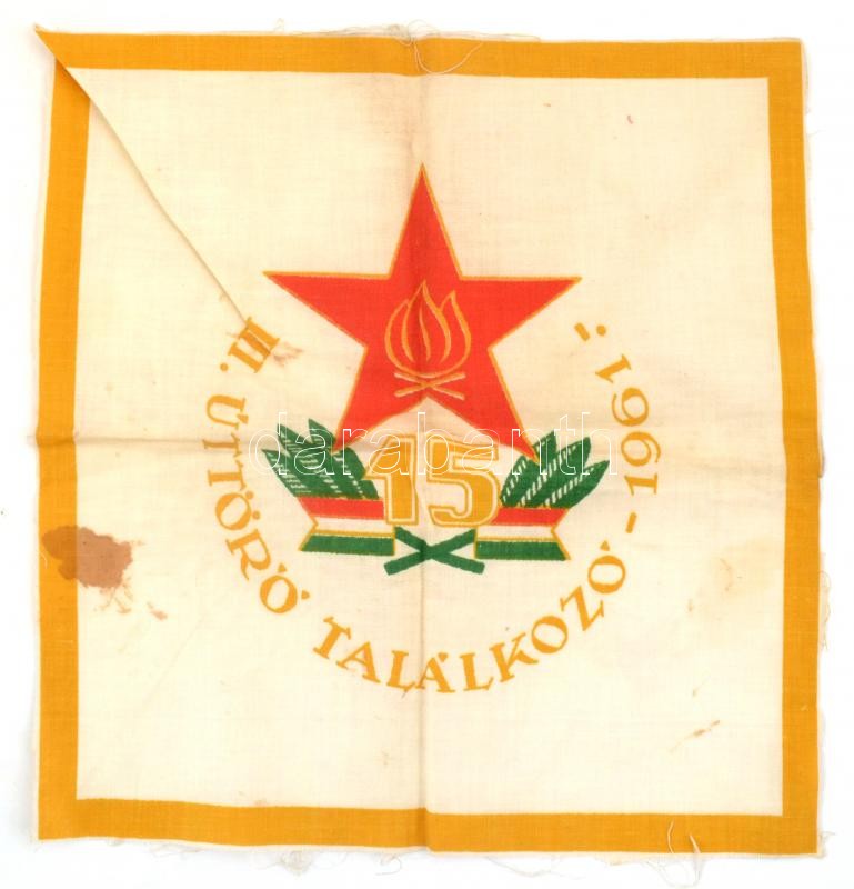 1961 III. Úttörő Találkozó 1961., úttörő kendő, foltos, 23x21 cm. https://www.darabanth.com/hu/369-Gyorsarveres/369.0/Mutargy-papirregiseg-egyeb/Bolhapiac~500011/1961-III-Uttoro-Talalkozo-1961-uttoro-kendo-foltos-23x21-cm~II2149086