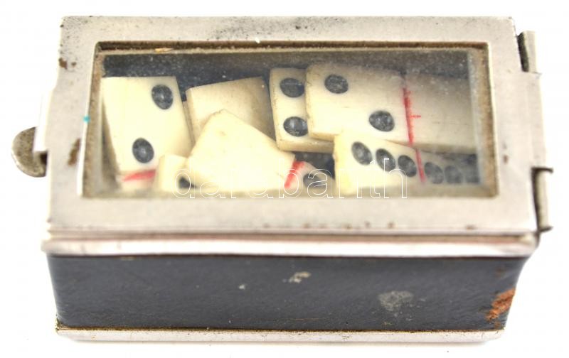 Leírás: 26 db régi mini csont dominó, kis bőr borítású fém dobozban, 0,8x1,5 cm, doboz: 4x2x2 cm