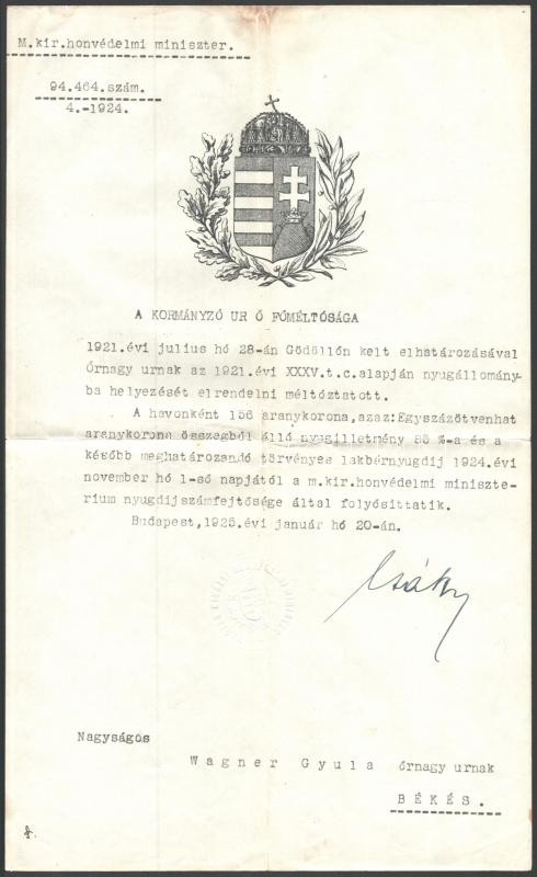 Leírás: 1925 Bp., Wágner Gyula huszárőrnagy nyugállományba helyezési parancsa Csáky Károly honvédelmi miniszter saját kezű aláírásával