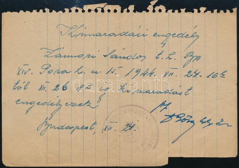 Leírás: 1944 Kimaradási engedély katona részére Karácsonyra