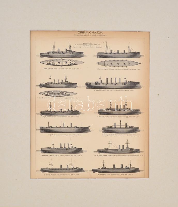 cca 1897-99 Cirkálóhajók (nevezetesebb páncél- és védett cirkálóhajók), nyomat, Pallas Nagy Lexikona, 1:1000, Bp., Pallas Rt. nyomdája. Különböző államok (német, japán, orosz, osztrák-magyar stb.) haditengerészeti hajóinak korabeli képeivel, hosszúságával és a kiszorított víz súlyával. 12 klf. hadihajó egy lapon: Fürst Bismarck, Giuseppe Garibaldi, VI. Károly császár stb. paszpartuban, hajtásnyommal, 28×22,5 cm / cca 1897-99 navy battleship cruisers of different countries (Russia, USA, Italy, Japan, Austria-Hungary, United Kingdom), 12 different ships (Fürst Bismarck, Giuseppe Garibaldi etc.), print from hungarian encyclopedia Pallas, in passepartout