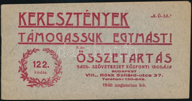 1940 Keresztények Támogassuk Egymást! Az Összetartás Gazd. Szöv. 1940.... https://www.darabanth.com/hu/369-Gyorsarveres/369.0/Mutargy-papirregiseg-egyeb/Nyomtatvanyok~500028/1940-Keresztenyek-Tamogassuk-Egymast-Az-Osszetartas-Gazd-Szov-1940-augusztusi-propaganda-f~II2148859