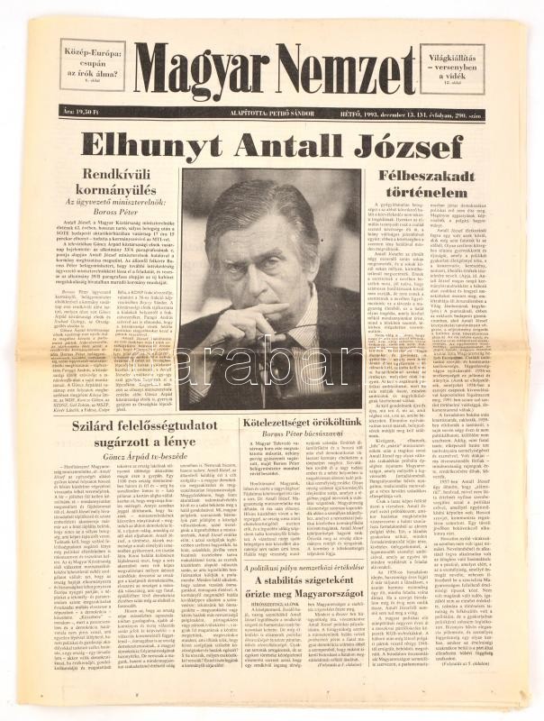 Leírás: 1993 Magyar Nemzet. 1993. dec. 13. LVI. évf., 290. sz. Benne a címlapon Antall József halál hírével.