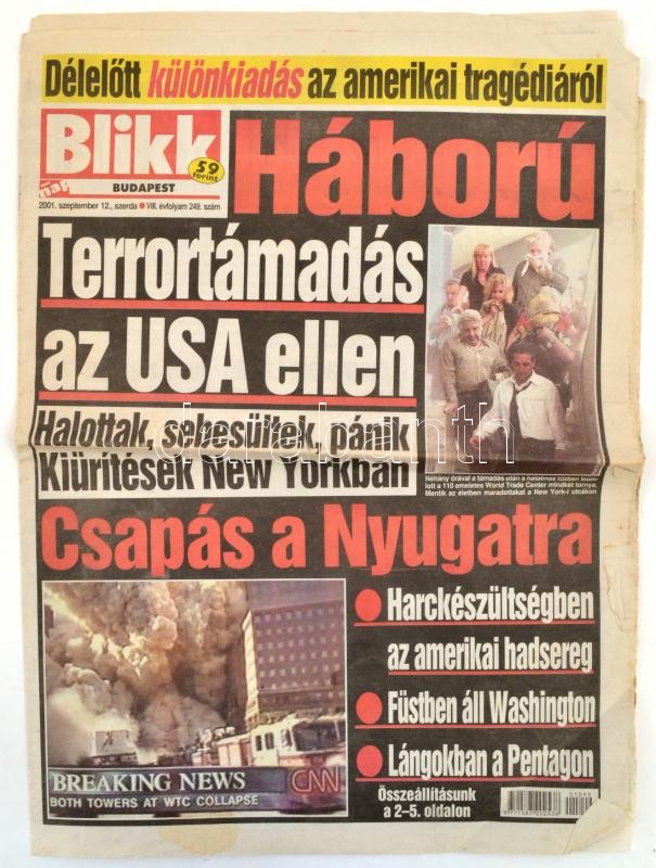 2001. szeptember 12. Blikk VIII. évfolyam 249. szám, címlapon a szepte... https://www.darabanth.com/hu/369-Gyorsarveres/369.0/Mutargy-papirregiseg-egyeb/Nyomtatvanyok~500028/2001-szeptember-12-Blikk-VIII-evfolyam-249-szam-cimlapon-a-szeptember-11-diki-terrortamada~II2145706