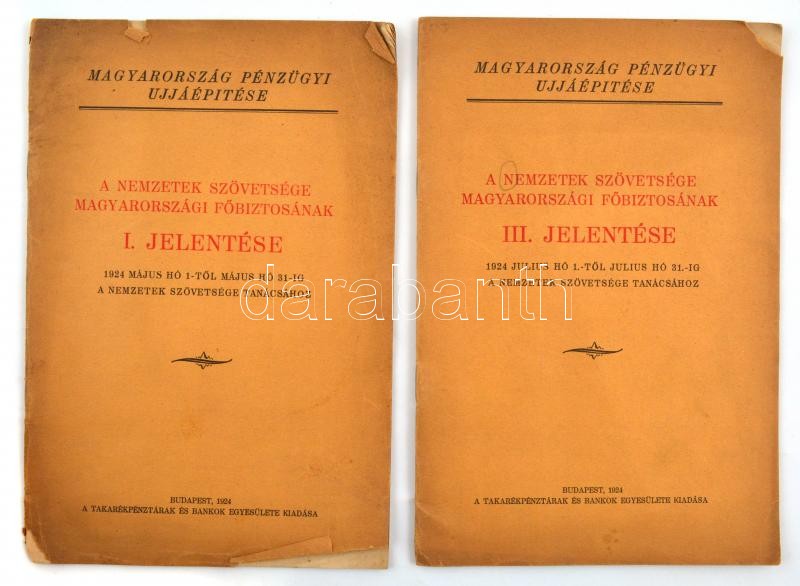 Magyarország pénzügyi újjáépítése. A Nemzetek Szövetsége magyarországi főbiztosának I, III. jelentése 1924 május hó 1.-től julius hó 31.-ig a Nemzetek Szövetsége tanácsához. Bp. 1924. Takarékpénztárak és Bankok Egyesülete. 20 l. Fűzve, kissé sérült kiadói borítékban.