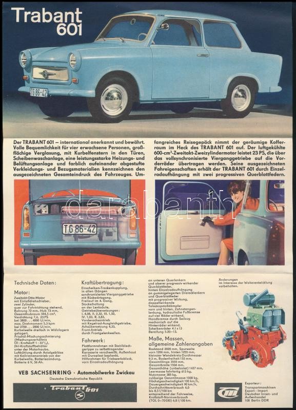 Leírás: cca 1966 Trabant 601 személyautó német nyelvű, kihajtható prospektusa.