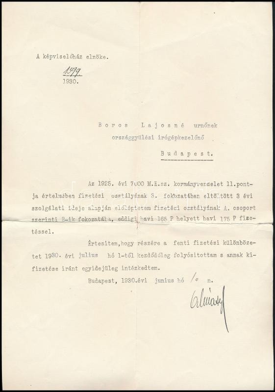 1930 Képviselőházi alkalmazott fizetési osztályának változásáról szóló okirat Almásy László (1869-1936) politikus, jogász, a képviselőház elnöke saját kezű aláírásával, hajtva