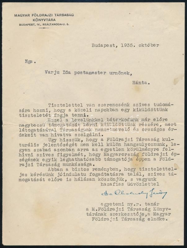 1935 Bp., Magyar földrajzi Társaság Könyvtára fejléces levélpapírjára ... https://www.darabanth.com/hu/369-Gyorsarveres/369.0/Mutargy-papirregiseg-egyeb/Okmanyok~500016/1935-Bp-Magyar-foldrajzi-Tarsasag-Konyvtara-fejleces-levelpapirjara-irt-level-Cholnoky~II2143891