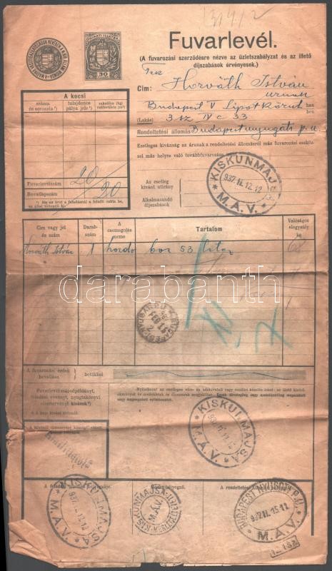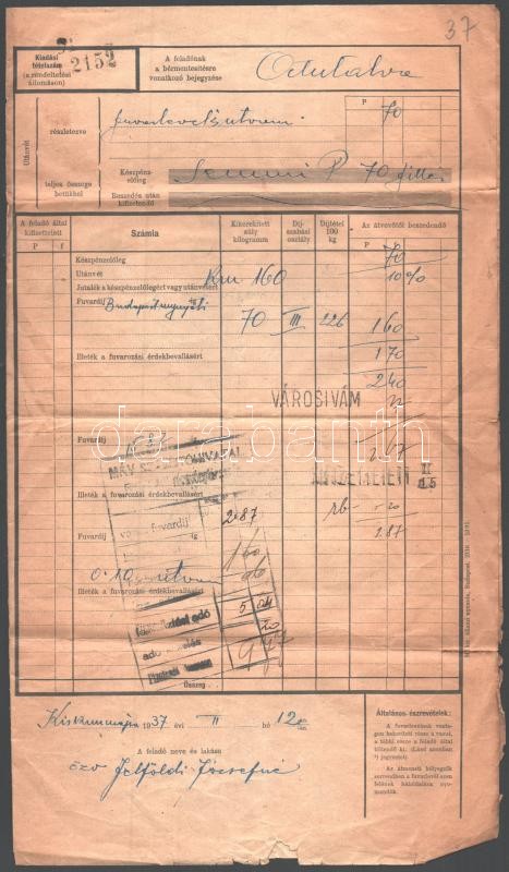 Leírás: 1937 Kiskunmajsa, fuvarlevél bélyegzésekkel.