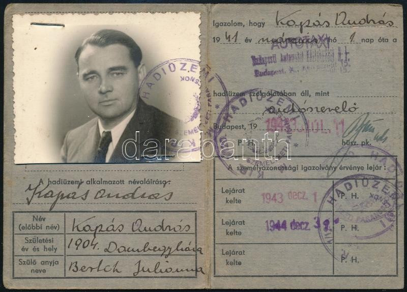 1941-1944 M. Kir. Hadiüzemi autószerelő munkás fényképes személyazonos... https://www.darabanth.com/hu/369-Gyorsarveres/369.0/Mutargy-papirregiseg-egyeb/Okmanyok~500016/1941-1944-M-Kir-Hadiuzemi-autoszerelo-munkas-fenykepes-szemelyazonossagi-igazolvanya~II2117868