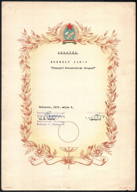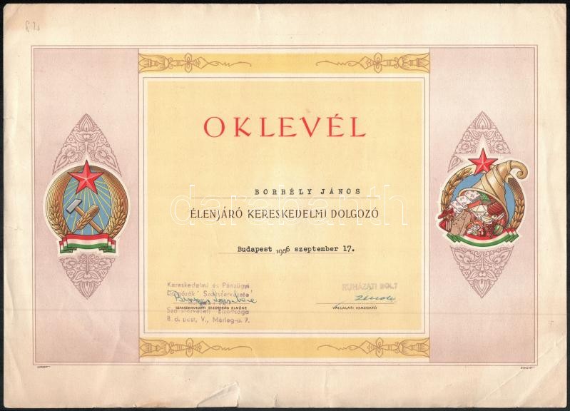 1955-1956 Élenjáró kereskedelmi dolgozó számára kiállított oklevél + 5... https://www.darabanth.com/hu/369-Gyorsarveres/369.0/Mutargy-papirregiseg-egyeb/Okmanyok~500016/1955-1956-Elenjaro-kereskedelmi-dolgozo-szamara-kiallitott-oklevel-plus-5-db-egyeb-oklevel~II2143953
