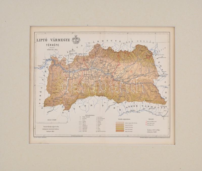 1895 Liptó vármegye térképe, terv. Gönczy Pál, Pallas Nagy Lexikona, 1:325000, Bp., Posner Károly Lajos és fia, paszpartuban, hajtásnyommal, lap alján két apró szakadással, 22×28 cm / 1896, map of Liptov county, now part of Slovakia, in passepartout, with very small tear on the edge