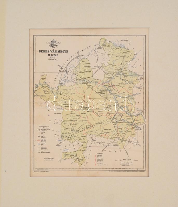 1896 Békés vármegye térképe, terv. Gönczy Pál, Pallas Nagy Lexikona, 1:380000, Bp., Posner Károly Lajos és fia, paszpartuban, hajtásnyommal, lap széle apró szakadásokkal és enyhén foltos, 28×22,5 cm /