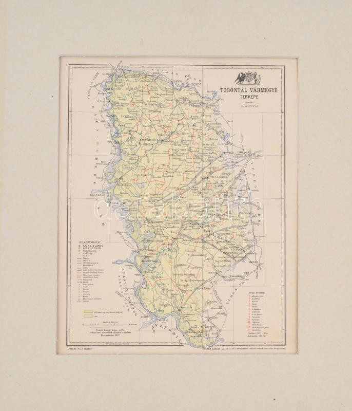 1897 Torontál vármegye térképe, terv. Gönczy Pál, Pallas Nagy Lexikona, 1:663750, Bp., Posner Károly Lajos és fia, paszpartuban, hajtásnyommal, 28×22,5 cm / 1897, map of Torontal county, now devided between Serbia, Romania and Hungary, in passepartout