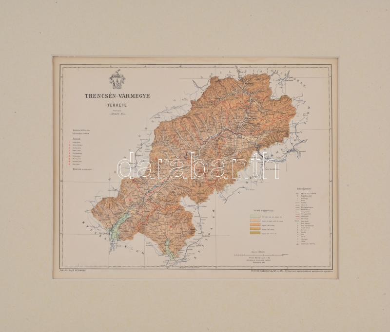 1897 Trencsén vármegye térképe, terv. Gönczy Pál, Pallas Nagy Lexikona, 1:525000, Bp., Posner Károly Lajos és fia, paszpartuban, hajtásnyommal, lap teteje foltos, 22×27,5 cm / 1897, map of Trencin county, now Slovakia, in passepartout, upper edge spotty