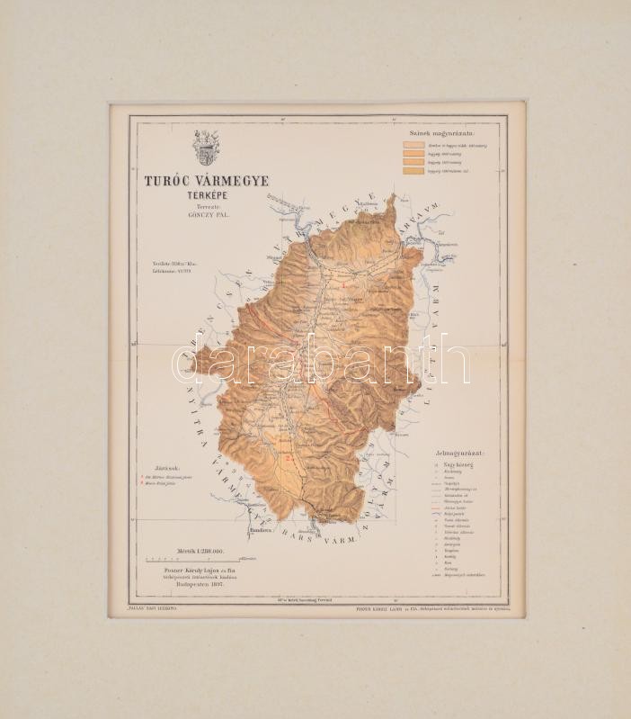 1897 Turóc vármegye térképe, terv. Gönczy Pál, Pallas Nagy Lexikona, 1:288000, Bp., Posner Károly Lajos és fia, paszpartuban, hajtásnyommal, 27,5×22,5 cm / 1897, map of Turiec county, now Slovakia, in passepartout