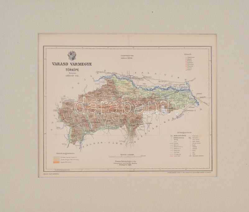 1897 Varasd vármegye térképe, terv. Gönczy Pál, Pallas Nagy Lexikona, 1:450000, Bp., Posner Károly Lajos és fia, paszpartuban, hajtásnyommal, kis folttal, 22,5×28 cm / 1897, map of Varaždin county, now Croatia, in passepartout, with a small spot