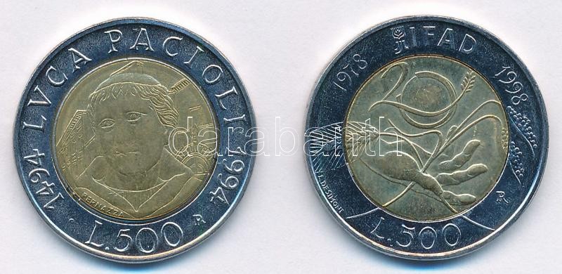 Italy 1... https://www.darabanth.com/hu/369-Gyorsarveres/369.0/Numizmatika/Kulfoldi-fem-es-ezustpenzek~2000014/Olaszorszag-1994-500L-Luca-Pacioli-plus-1998-500L-IFAD-T2-Italy-1994-500-Lire-Luca-Pacioli-~II2148010