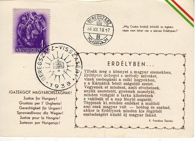 Leírás: Irredentra verses lap "Kassa viszzatért" alkalmi bélyegzéssel