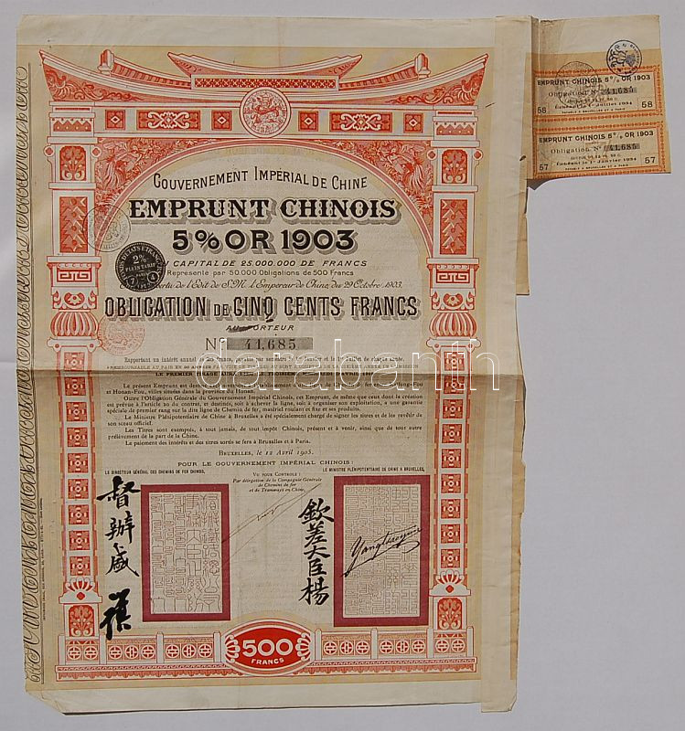 Kína 1905. Állami részvény https://www.darabanth.com/hu/37-Gyorsarveres/37.0/Numizmatika/Reszvenyek-ertekpapirok-sorsjegyek-takarekbetetkonyvek~196/Kina-1905-Allami-reszveny~II73037