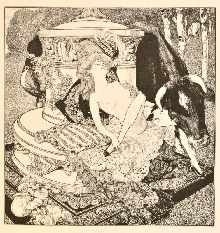 Leírás: Franz von Bayros (1866-1924): Jupiter & Europa. a Der Toilettentisch mappából Klisé, papír, jelzés nélkül, 12,5×12,5 cm