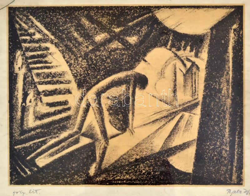 Leírás: Bala...(?) jelzéssel: Expresszionista álom. Litográfia, papír, üvegezett fa keretben, sérült üveggel és kerettel,23×28,5 cm