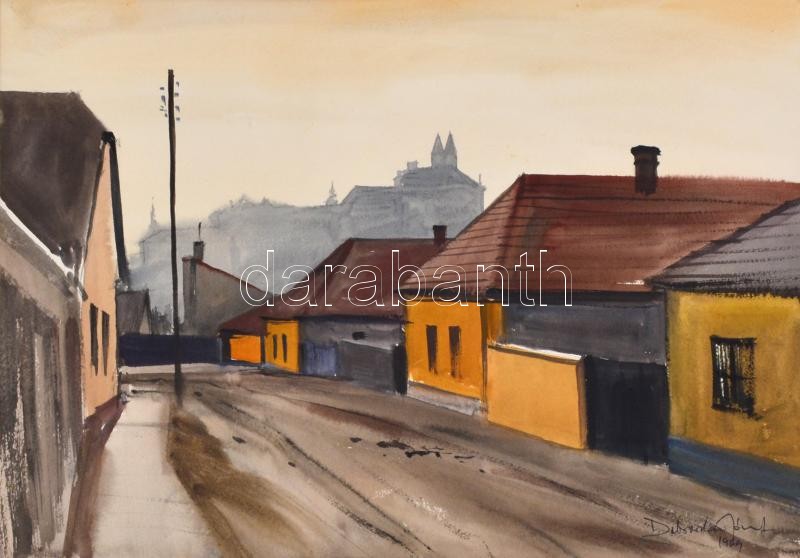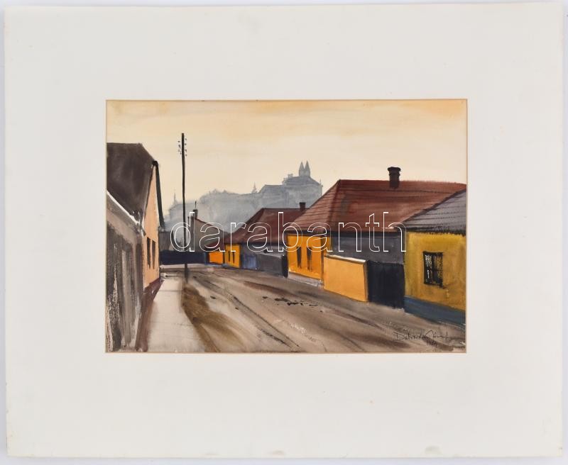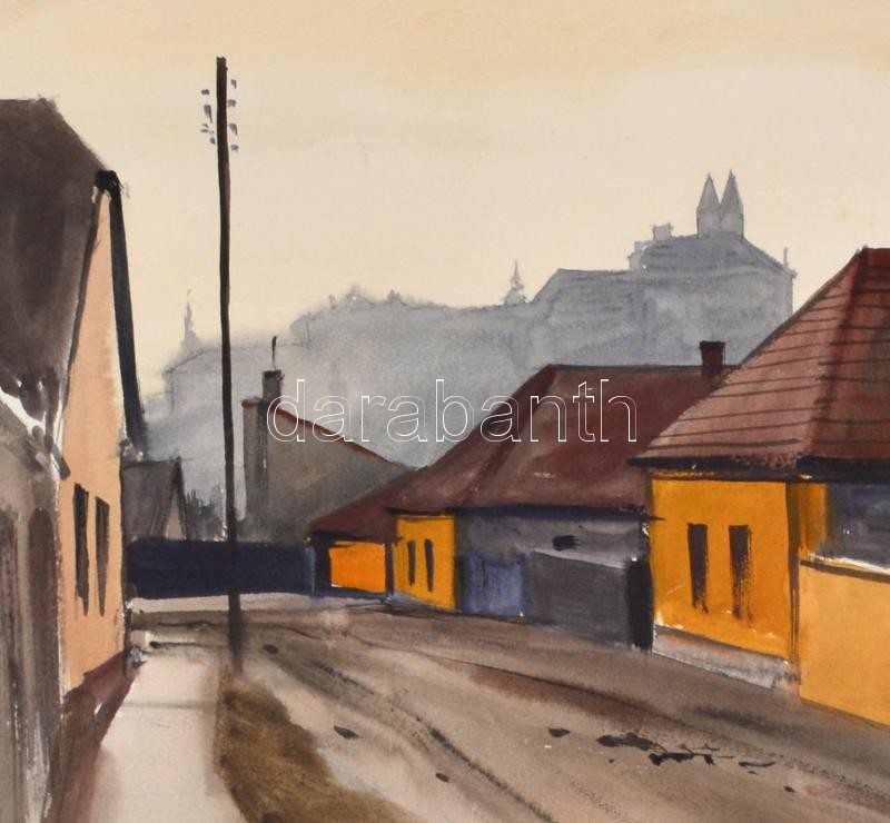 Dobroszláv József (1932-2016): Veszprémi utca. Akvarell, papír, jelzett, datált (1969), paszpartuban, a hátoldalán a művész saját kezű soraival, 32,5x46,5 cm