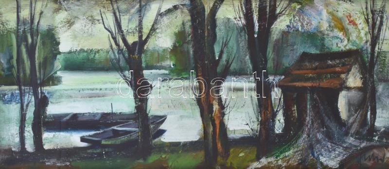 Leírás: Fodor József (1935-2007): Tiszapart. Olaj, farost, jelzett, üvegezett fa keretben, hátoldalán a művész autográf feliratával, 32x75 cm