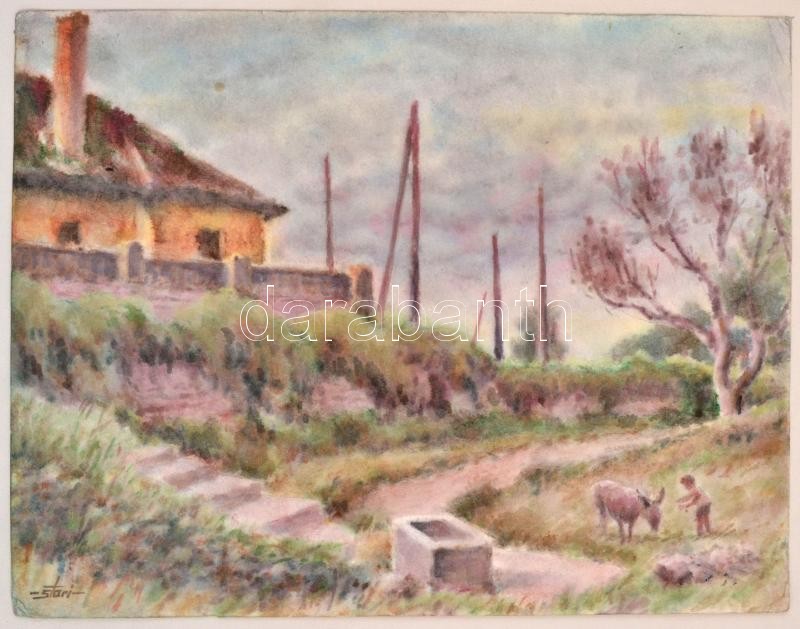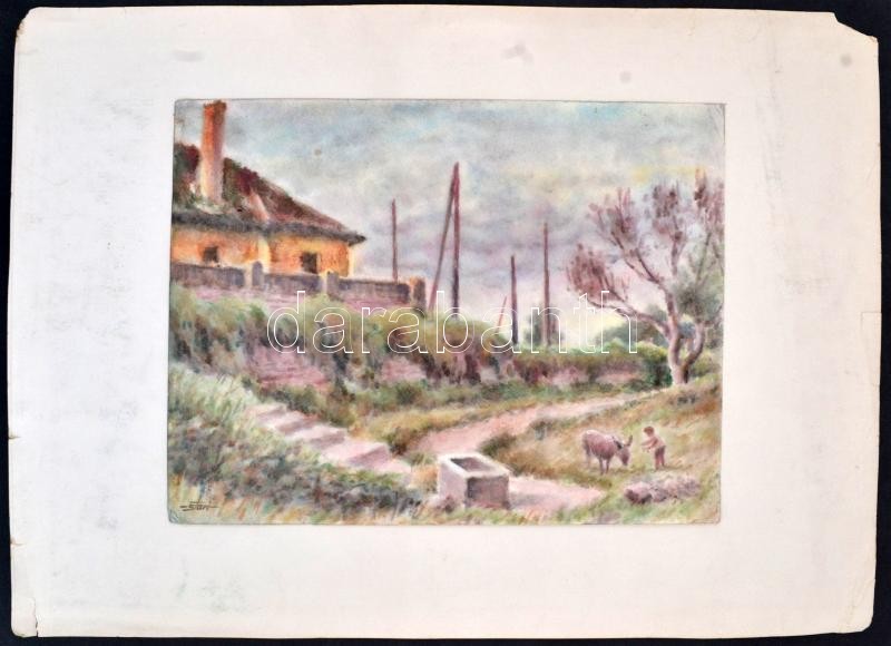 Sostarics Lajos (1896-1968): Óbuda, Kiscell. Akvarell, papír, jelzéssel, kartonra ragasztva, karton sérült, szakadt, a kép a sarkaiban enyhén gyűrött 23×30 cm