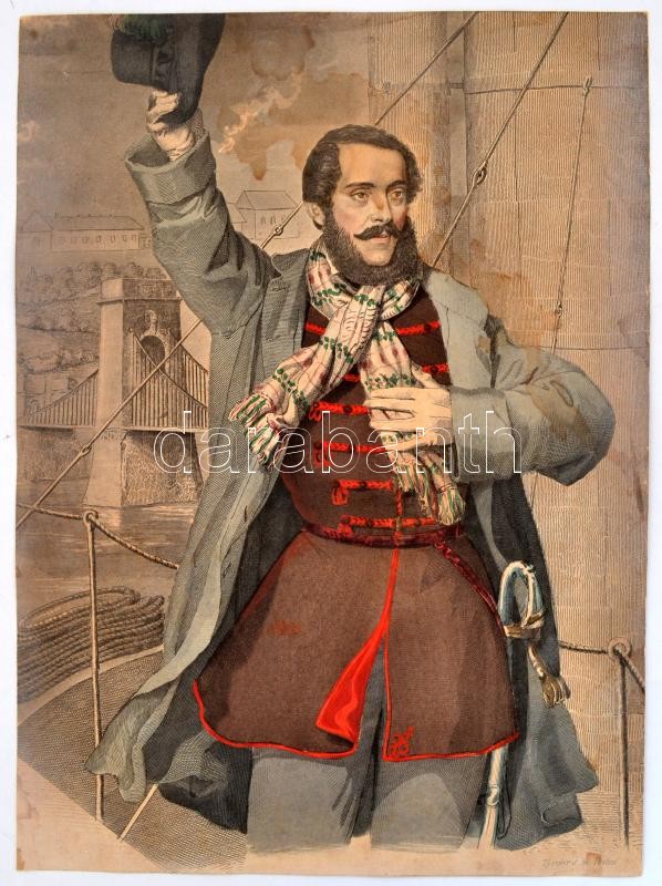 Tyroler József (1822-1854): Kossuth Lajos megérkezése Pest-Budára a pozsonyi országgyűlésről 1848. április 14-én, színezett fametszet, későbbi színezés, körbevágott, foltos, 31x23 cm