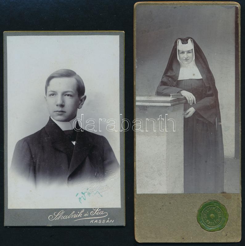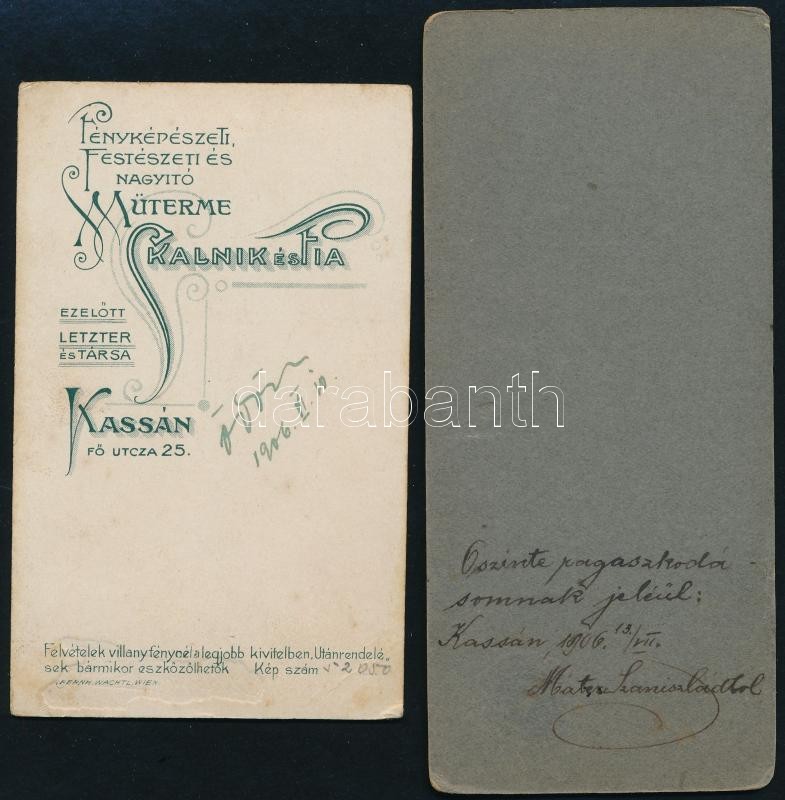Leírás: 1906 Kassa, Skalnik és Fia fényképész műtermében készült, 2 db feliratozott vintage fotó, 13x5,8 cm és 10,3x6,5 cm