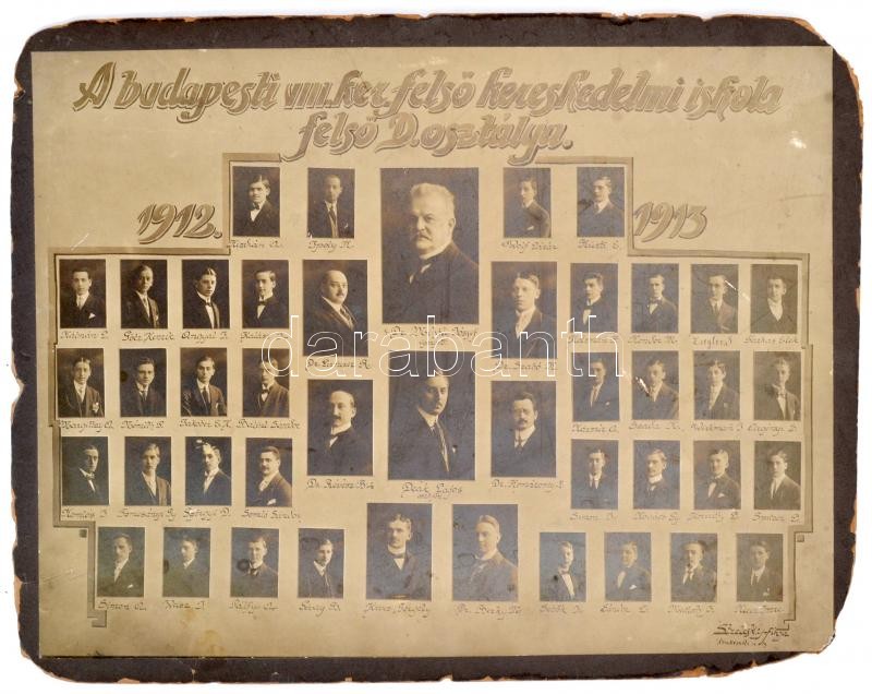 1913 Budapest, a VIII. kerületi Felső Kereskedelmi Iskola tanárai és végzős osztálya, kistabló nevesített portrékkal, kisebb sérülésekkel, 27x36 cm, karton 30x39 cm