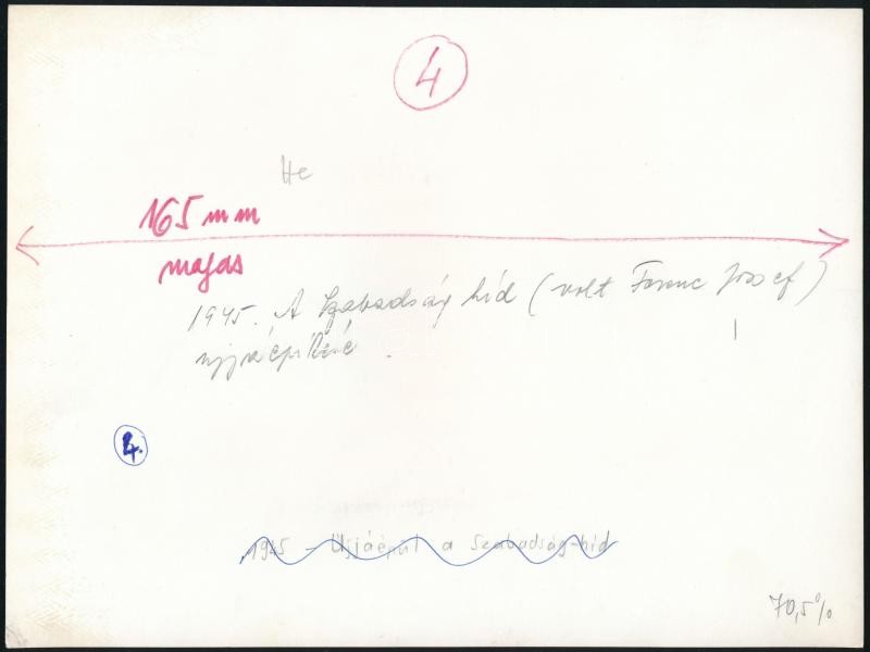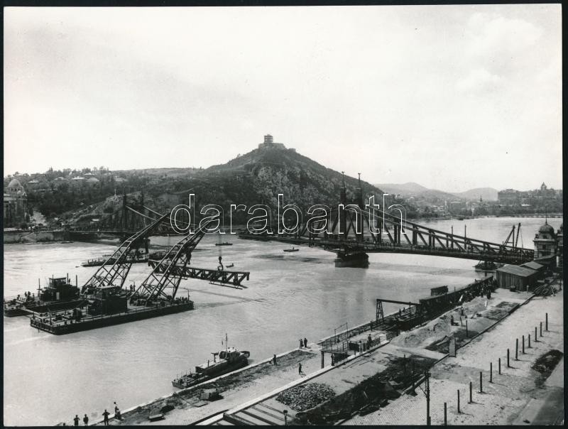 Leírás: 1945 A volt Ferenc József híd (Szabadság híd) elemének beemelése a háború utáni újjáépítéskor, hátoldalon feliratozott, publikált fotó, 17,5×23,5 cm