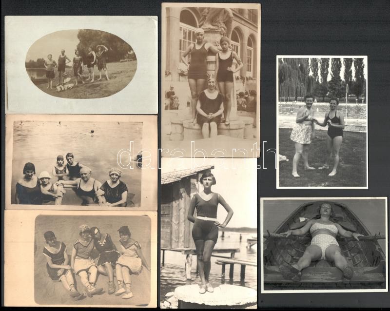 Leírás: A női fürdőruhák evolúciója, cca 1900 és 1970 között, különböző helyszíneken készült, vintage fotók, 9x12 cm és 18x24 cm között