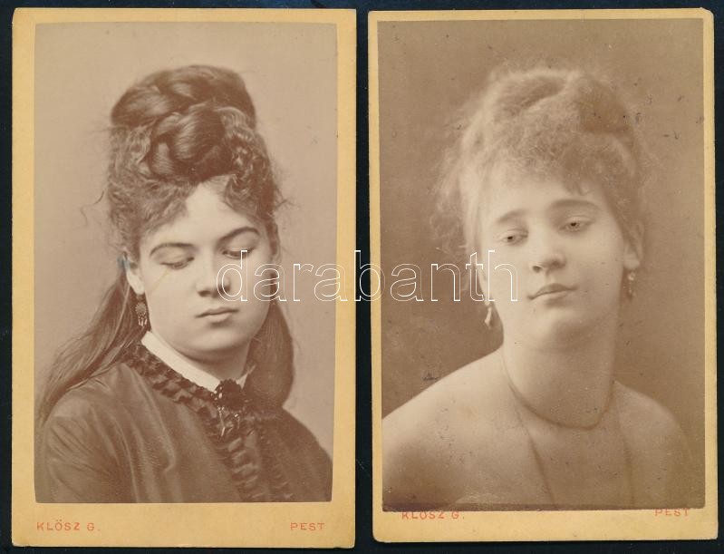 Leírás: Klösz György 2 db fotó portré tanulmány: Ártatlanság; Bujaság. vizitkártya méretű fotó ugyanarról a modellről