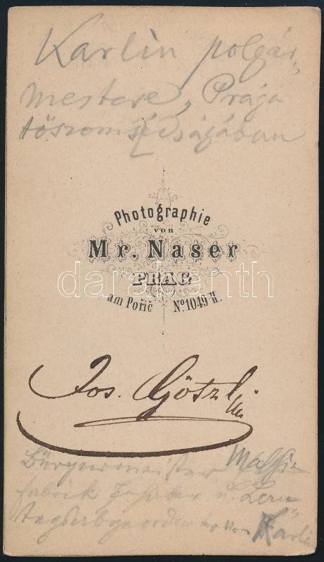 cca 1860-1870 Josef Götzl/Joseph Götzel (1820-1892) a Prága melletti Karlín város polgármestere, keményhátú fotó, Prága. Mr. Naser műterméből, a hátoldalon aláírt, a hátoldalon feliratozott, 10x6 cm/