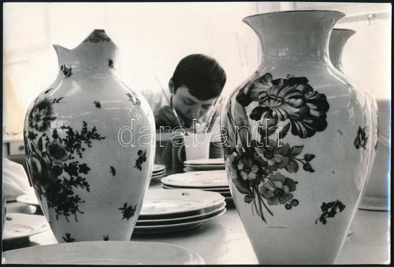 cca 1975 A Herendi Porcelángyár épülete kÃvülrÅ‘l, valamint kézzel festik a vázákat a gyárban, 2 db publikált fotó Urbán Tamás fotóművész alkotása, pecséttel jelzett, 12×18 és 16×24 cm-es méretben