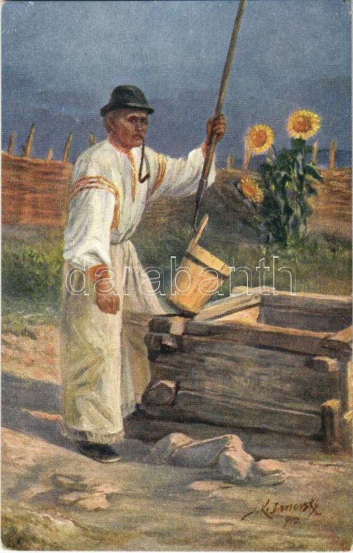 Leírás: Pöstyén, Pistyan, Piestany; Volkstypen. Serie XX. Slovaken bei Piestan Nr. 3. Am Brunnen / Szlovák folklór, a kútnál / Slovak folklore s: K. Janovsky