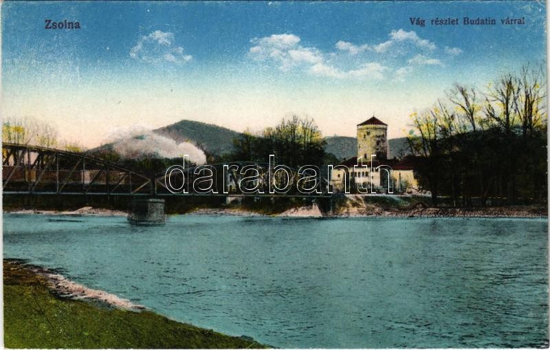 Zsolna, Sillein, Zilina; Vág részlet, Budatin vár, vasúti híd gőzmozdonnyal. Vasúti Levelezőlapárusítás 19. sz. / Váh river, castle, railway bridge with locomotive