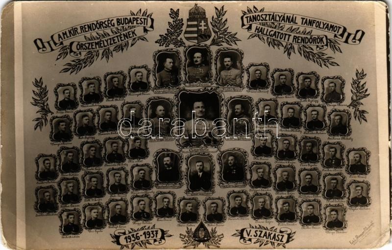 1936-1937 Budapest, A M. kir. rendőrség budapesti őrszemélyzetének tanosztályánál tanfolyamot hallgatott rendőrök, V. szakasz tablója, címer. Foto Magyar Nővérek photo / Hungarian policemen tableau (EK)