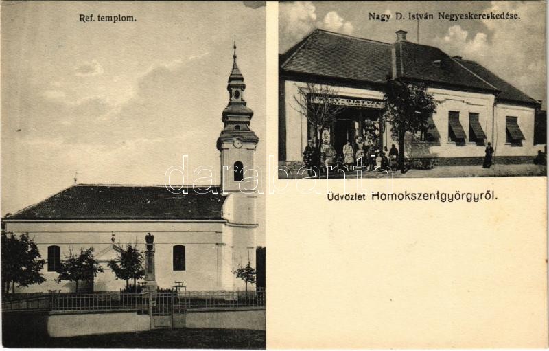 Leírás: Homokszentgyörgy, Homok Szt. György; Református templom, Nagy D. István vegyeskereskedése