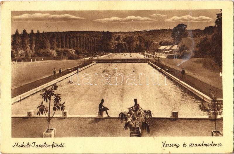 Leírás: Miskolctapolca, Görömbölytapolca, Görömbölyi-Tapolca, Tapolca (Miskolc); Verseny és strandmedence, fürdőzők (apró szakadás / tiny tear)