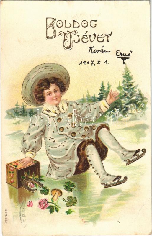 1907 Boldog Újévet! / New Year greeting card, girl ice skating, winter... https://www.darabanth.com/hu/370-Gyorsarveres/370.0/Kepeslapok/Udvozlolapok-Unnepek~1500088/1907-Boldog-Ujevet-New-Year-greeting-card-girl-ice-skating-winter-sport-clover-Ser-222-Em~II2155449