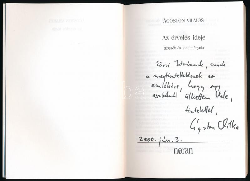 Ágoston Vilmos: Az érvelés ideje. DEDIKÁLT! Esszék és tanulmányok. H.n... https://www.darabanth.com/hu/370-Gyorsarveres/370.0/Konyvek/Konyvek-Egyeb-ritkasagok~1000022/Agoston-Vilmos-Az-erveles-ideje-DEDIKALT-Esszek-es-tanulmanyok-Hn-2000-Noran-Kiadoi~II2129102