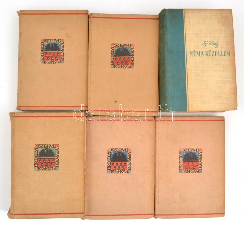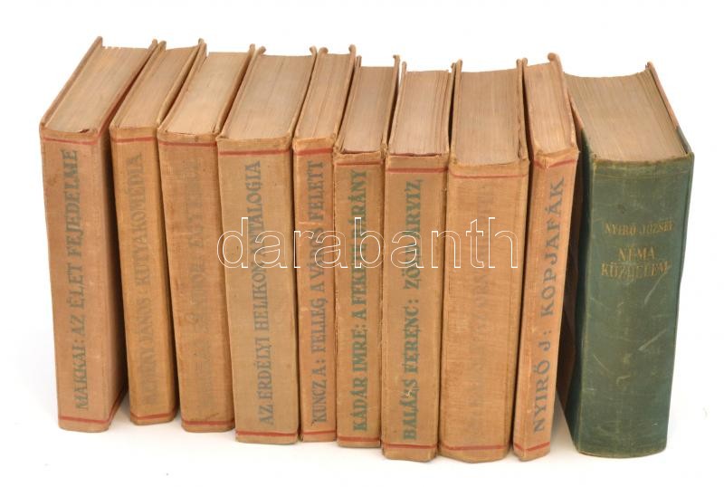 Közte Kós Károly: Az OrszágépÃtÅ‘, NyÃrÅ‘ József: Kopjafák, Erdélyi Helikon Antologia...stb. Kolozsvár, Erdélyi SzépmÃves Céh. Kiadói egészvászon-kötésekben, kopott borÃtókkal.+NyÃrÅ‘ József: Néma küzdelem. Bp.,1944, Révai. Kiadói félvászon-kötés, kopott, foltos borÃtóval.