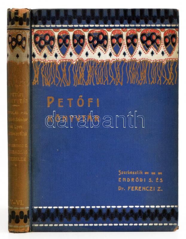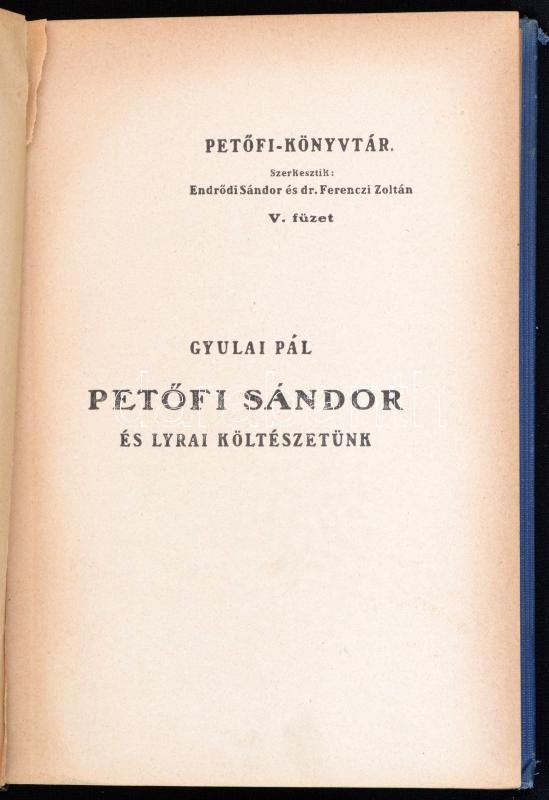 Gyulai Pál: Petőfi Sándor és lyrai költészetünk. Petőfi könyvtár, V. füzet. Bp., 1908, Kunossy, Szilágyi és Társa. Aranyozott, színezett szecessziós kiadói egész vászonkötés. Kissé sérült gerinccel és borítóval.