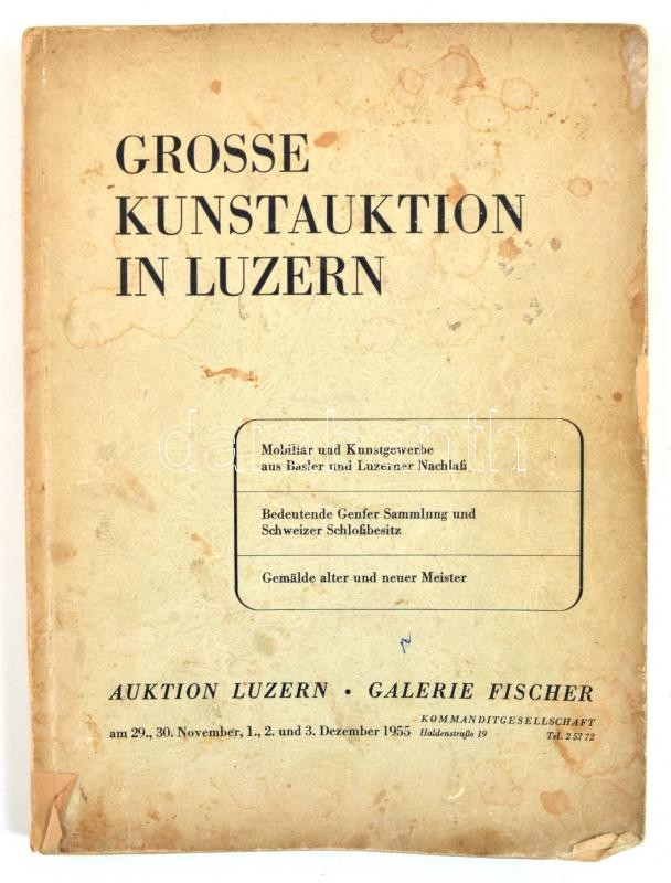 Leírás: 1955 Grosse Kunstauktion in Luzern. Auktion Luzern. Galerie Fischer. 1955 nov. 29-dec. 3. Festmény, műtárgy aukciós katalógus. Luzern,1955., Galerie Fischer, 122+2 p.+44 t. (fekete-fehér képtáblák.) Német nyelven. Kiadói papírkötés, foltos borítóval, a gerinc alján javítással.