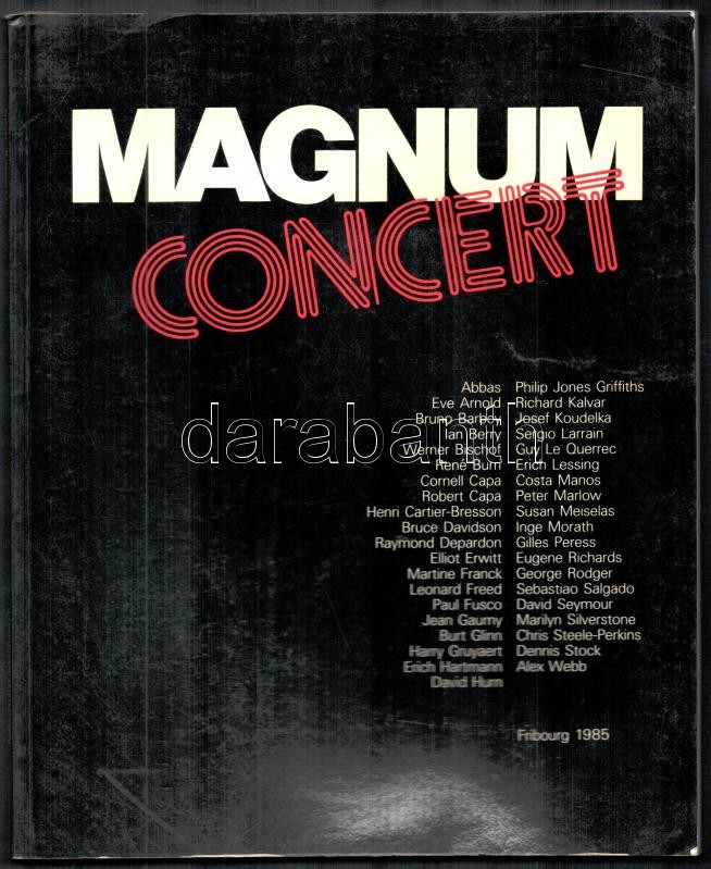 Magnum concert. Fribourg, 1985, Musee d'art et d'histoire de Fribourg. Kiállítási katalógus Erich Lessing, Robert és Cornell Capa és sokan mások fotóival. Kiadói papírkötés, hullámos lapokkal, kisebb foltokkal a lap alján. 109 p