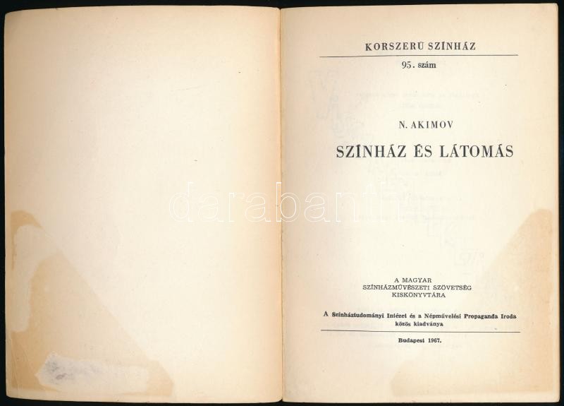Leírás: N. Akimov: Színház és látomás. Bp., 1967, Színháztudományi Intézet-Népművelési Propaganda Iroda. Kiadói papírkötés. Megjelent 1100 példányban.